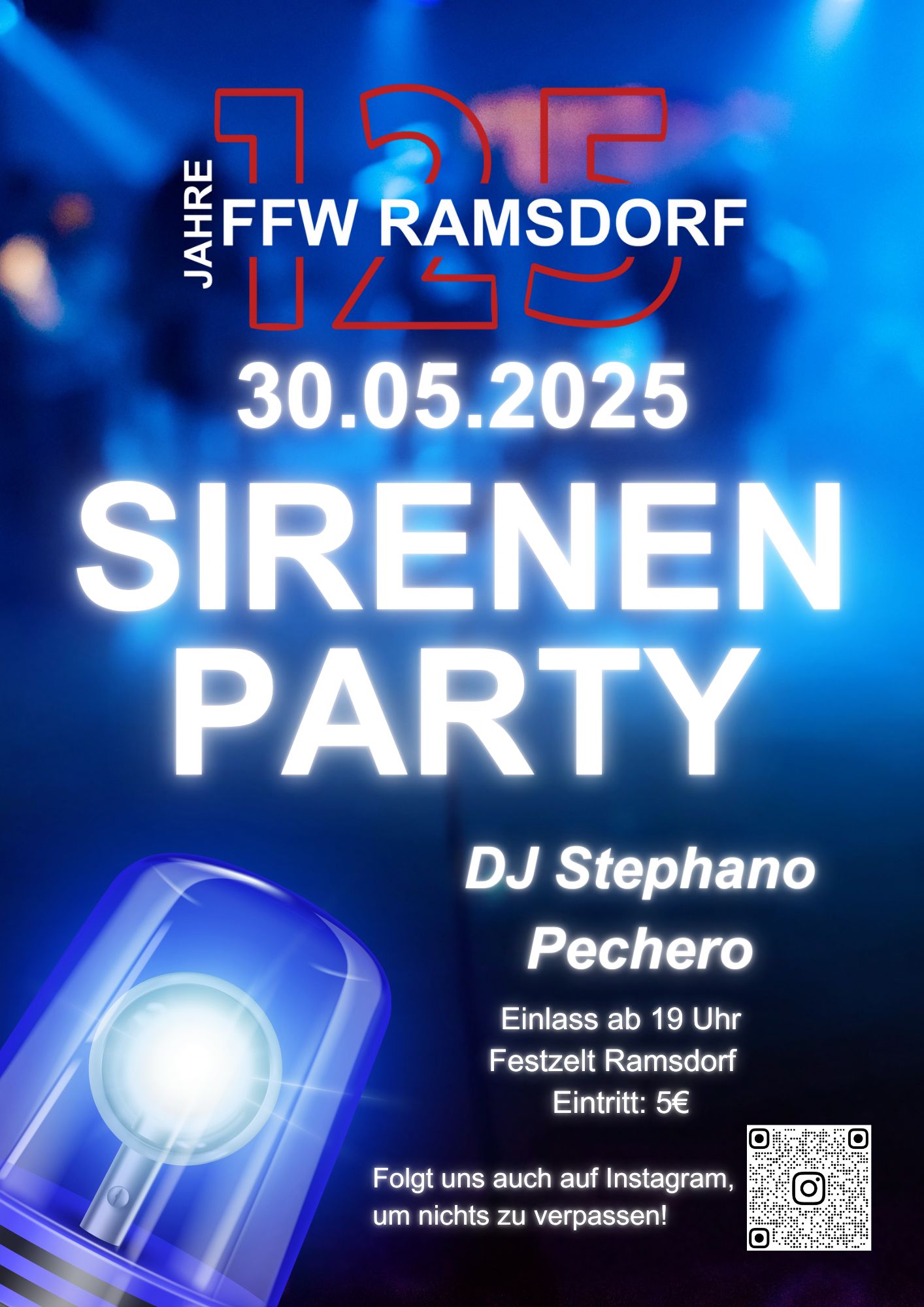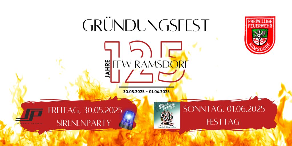 Die Freiwillige Feuerwehr Ramsdorf 125 Jahre Engagement, Mut und Gemeinschaft in Ramsdorfmehr über uns Retten, Löschen, Bergen, Schützen seit 1900 Unsere Jubiläumsveranstaltungen Sirenen Party am 30.5.Genießen Sie einen unvergesslichen Abend mit DJ Stephano Pechero im Festzelt Ramsdorf. Einlass ab 19 Uhr mit einem Eintritt von nur 5€.Mehr Festtag am 1.6.Feiern Sie mit uns den Höhepunkt unseres Jubiläumsjahres mit dem offiziellen Gründungsfest. Ein Tag voller Tradition, Gemeinschaft und Festlichkeiten.Mehr 125 Jahre FFW Ramsdorf Wir feiern von 30.Mai – 1. Juni 2025Mehr Wir bei der FFWUnsere Mission – Eine starke Truppe aus engagierten Freiwilligen, die jederzeit bereit ist zu helfen.Unsere Gemeinschaft – Schutz und Sicherheit für alle Bürgerinnen und Bürger in Ramsdorf und Umgebung zu gewährleisten.Unsere Geschichte – 125 Jahre Tradition und Innovation im Dienst der Sicherheit unserer Gemeinde.mehr Sirenen Party125 Jahre FFW Ramsdorf – Wir feiern am 30.05.2025Einlass ab 19 Uhr im Festzelt Ramsdorf Mehr Unsere Ansprechpartnerfür die FFW Ramsdorf im Jahr 2025 Daniel Eder1. Kommandant1.kommandant@ffw-ramsdorf.de Andreas Böckl1. Vorstand1.vorstand@ffw-ramsdorf.de Kontakt So können Sie uns erreichen NOTRUFNUMMER112 Emailfeuerwehrramsdorf@yahoo.com AddressEFreiwillige Feuerwehr Ramsdorf Ramsdorf – 94574 Wallerfing